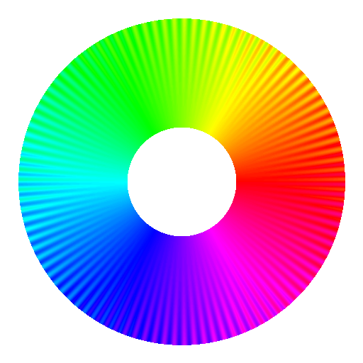 An equivalent circular image for evaluating cyclic colour maps has also been devised. It consists of a sine wave of 100 cycles superimposed on a spiral ramp function. The spiral ramp starts at a value of 0 pointing right, increasing anti-clockwise to a value of 2π as it completes the full circle. This gives a 2π discontinuity on the right side of the image. The amplitude of the superimposed sine wave is modulated from its full value at the outside of the circular pattern to 0 at the centre. The sine wave amplitude of π/10 means that the overall size of the sine wave from peak to trough represents 10% of the total spiral ramp of 2π. It is rendered here using a linear grey colour map to illustrate the cyclic discontinuity. If the colour map is cyclic then this discontinuity should not be apparent.